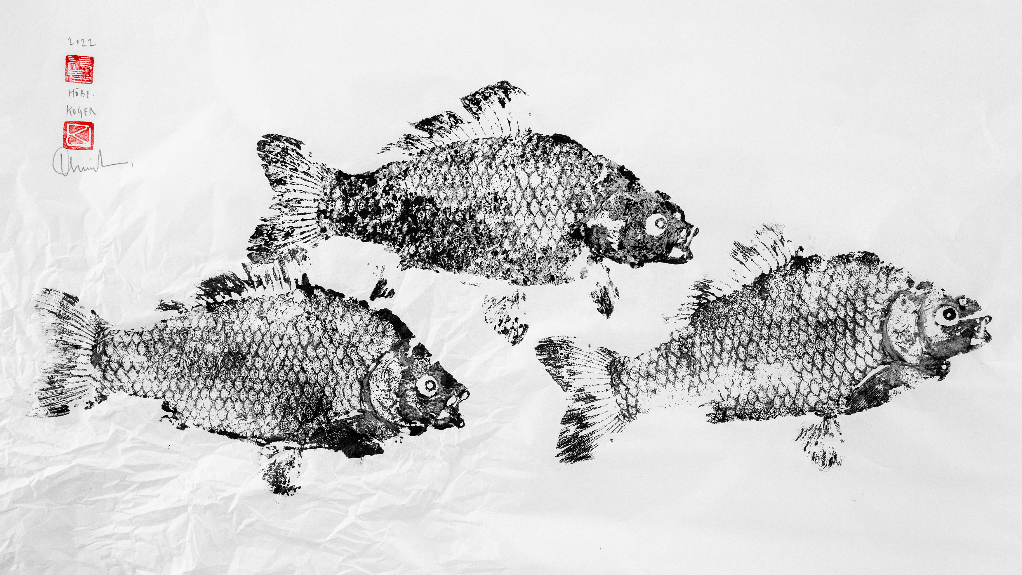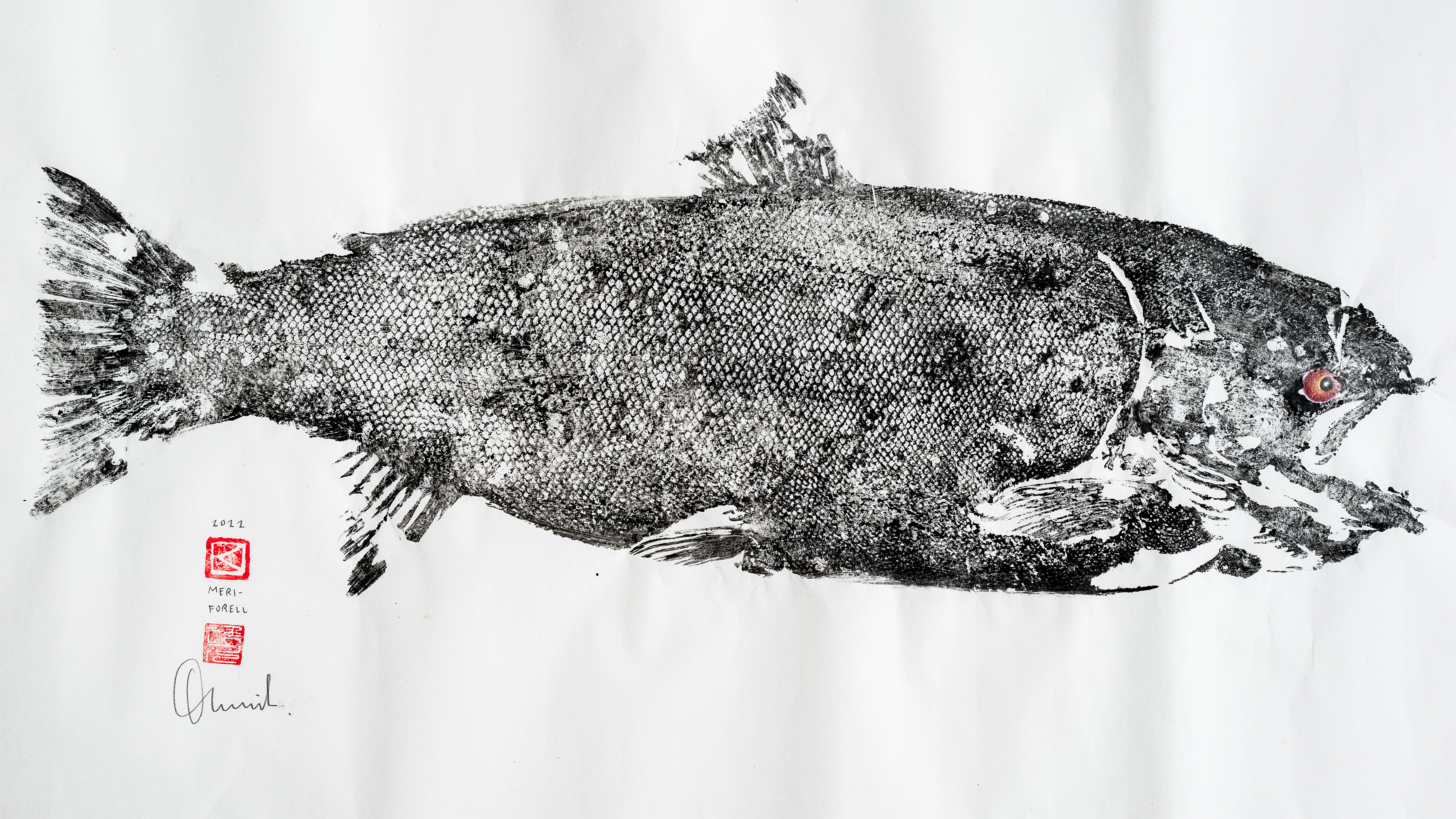 I started by printing cleaned fish heads and skins in pieces. Eventually, I began inking whole fish directly and taking full-body impressions as it was traditionally done. Over time, I grew restless with the traditional method and began drawing over the prints, turning them into paintings where the fish became both fact and fantasy.