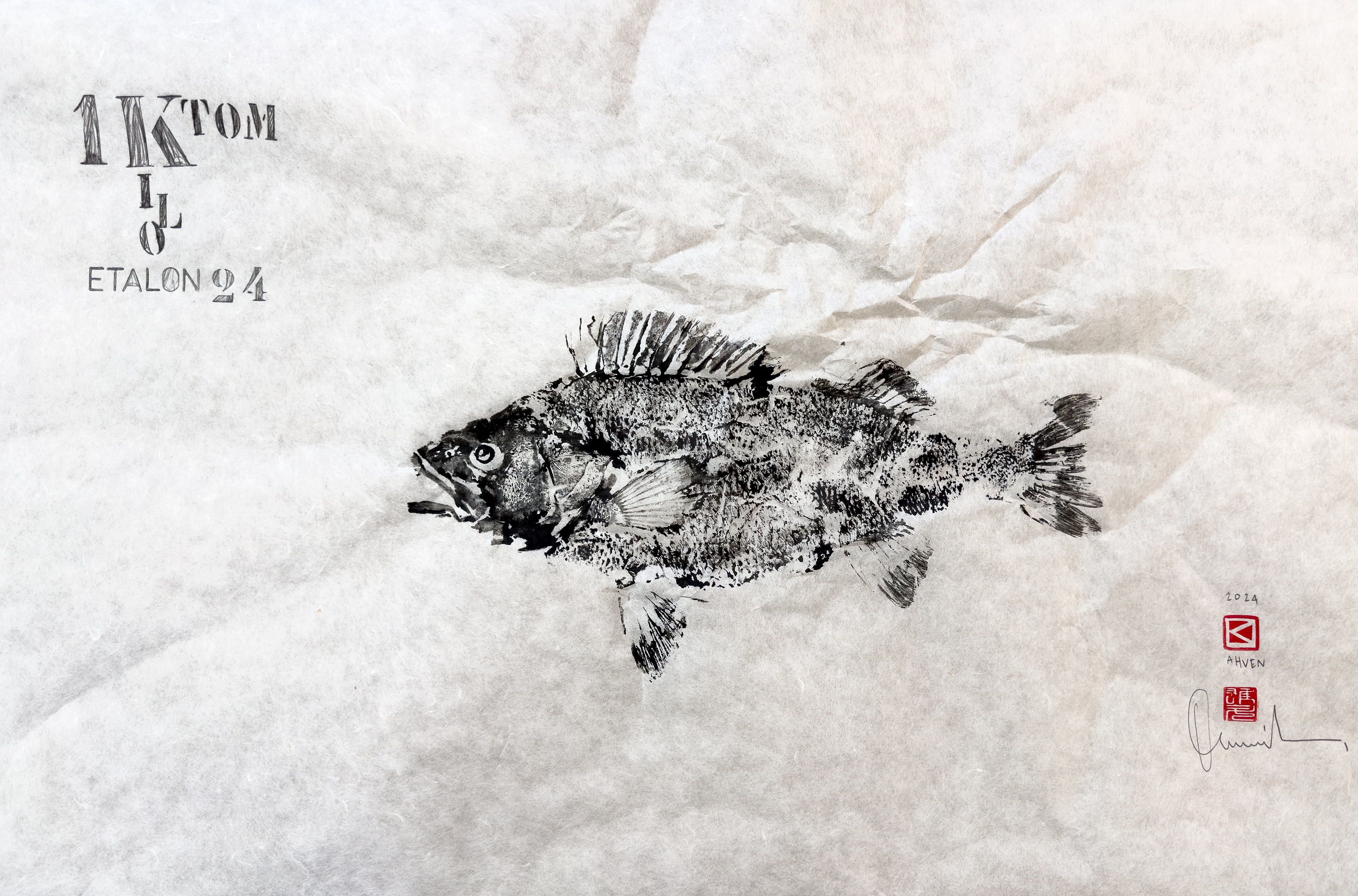 What fascinates me most about gyotaku is how each print, even from the same fish, turns out unique. The choice of paper—especially crinkled or wrinkled—can give the image a fossil-like texture, adding an ancient, almost geological feel to a freshly caught creature.