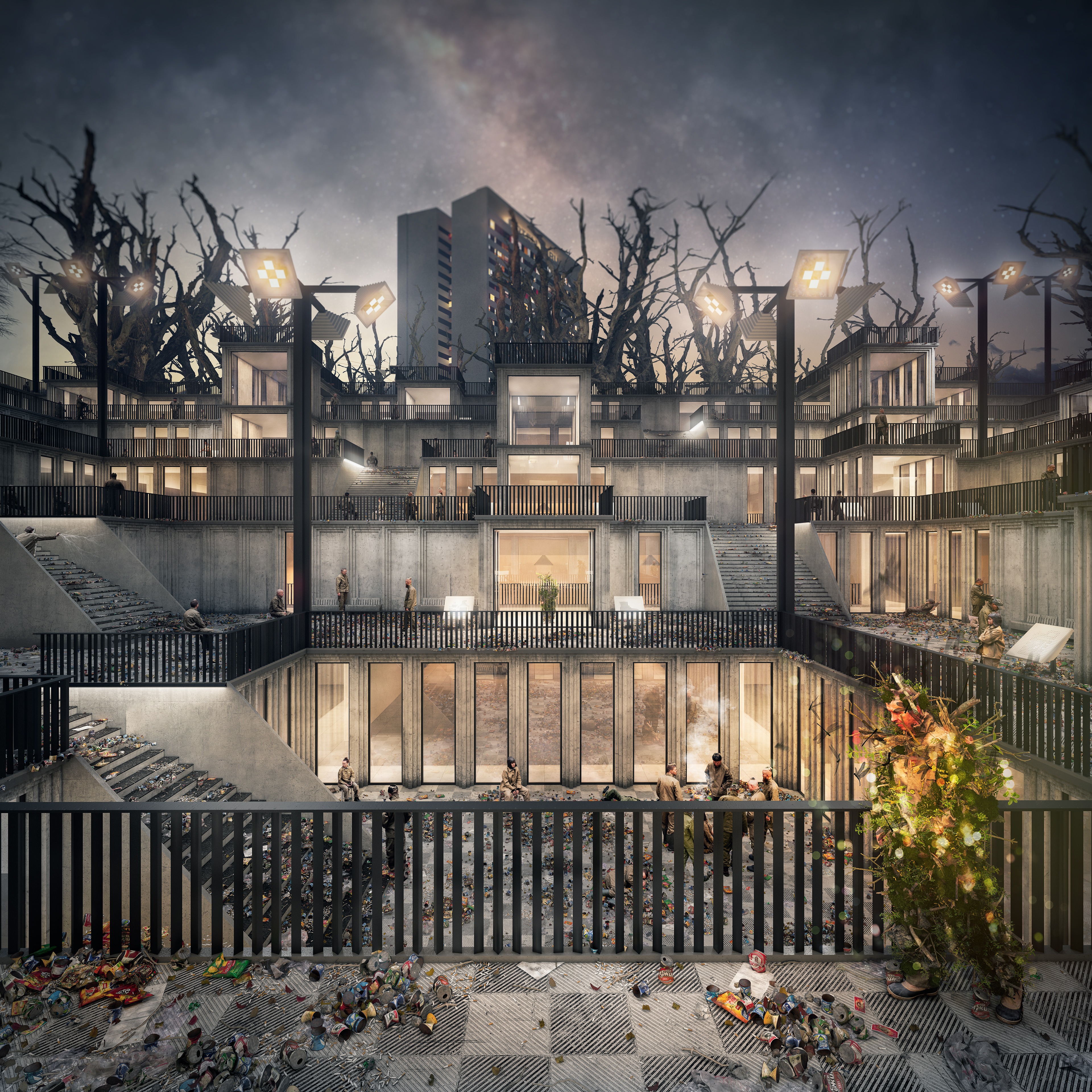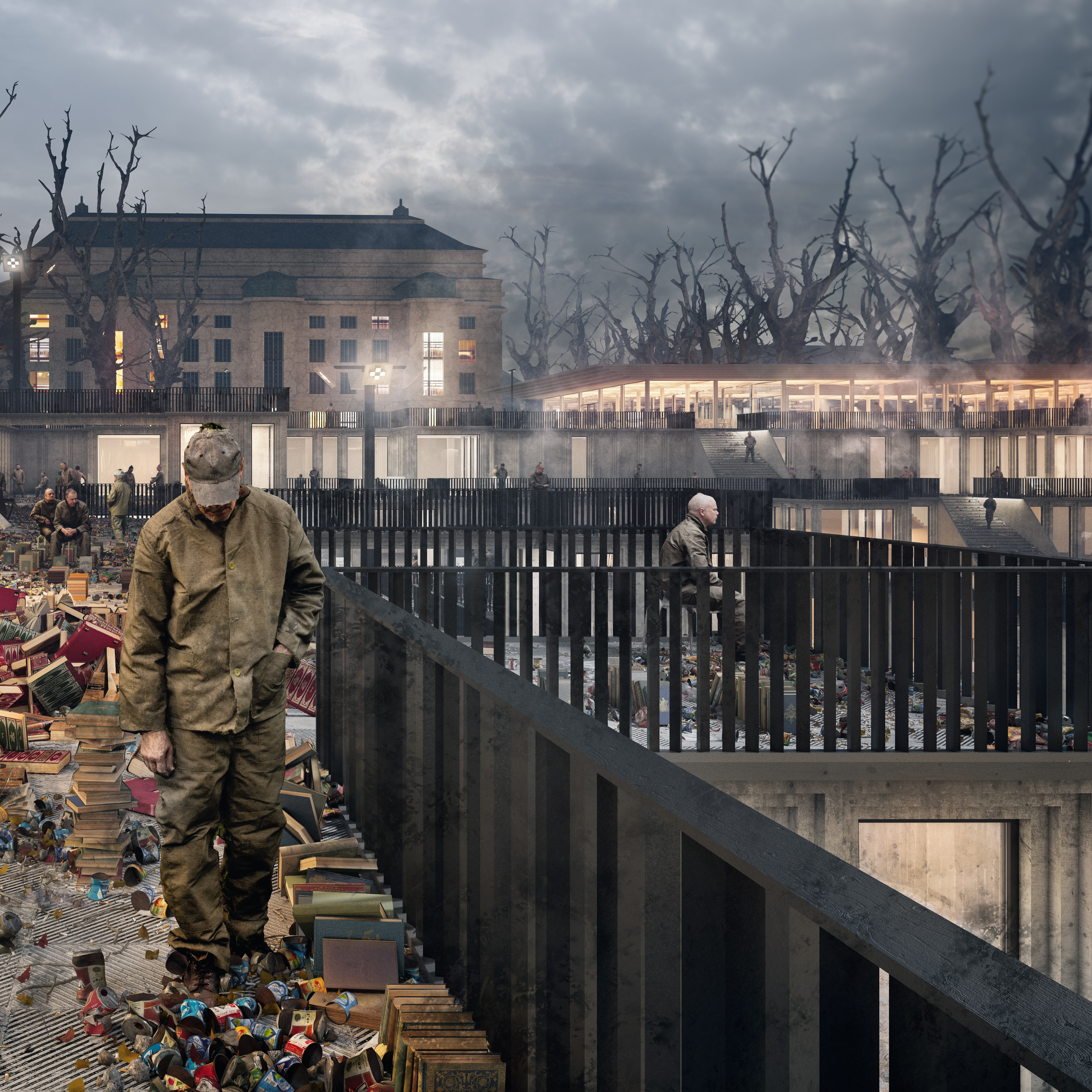 The proposed Temple is situated in downtown Tallinn at the location of the current Tammsaare Park (designed by KTA in 2012-2016). It is a stepwell with multiple levels. It fills up with waste as our civilization gradually reduces our pollutive practices or as it collapses under its own load.